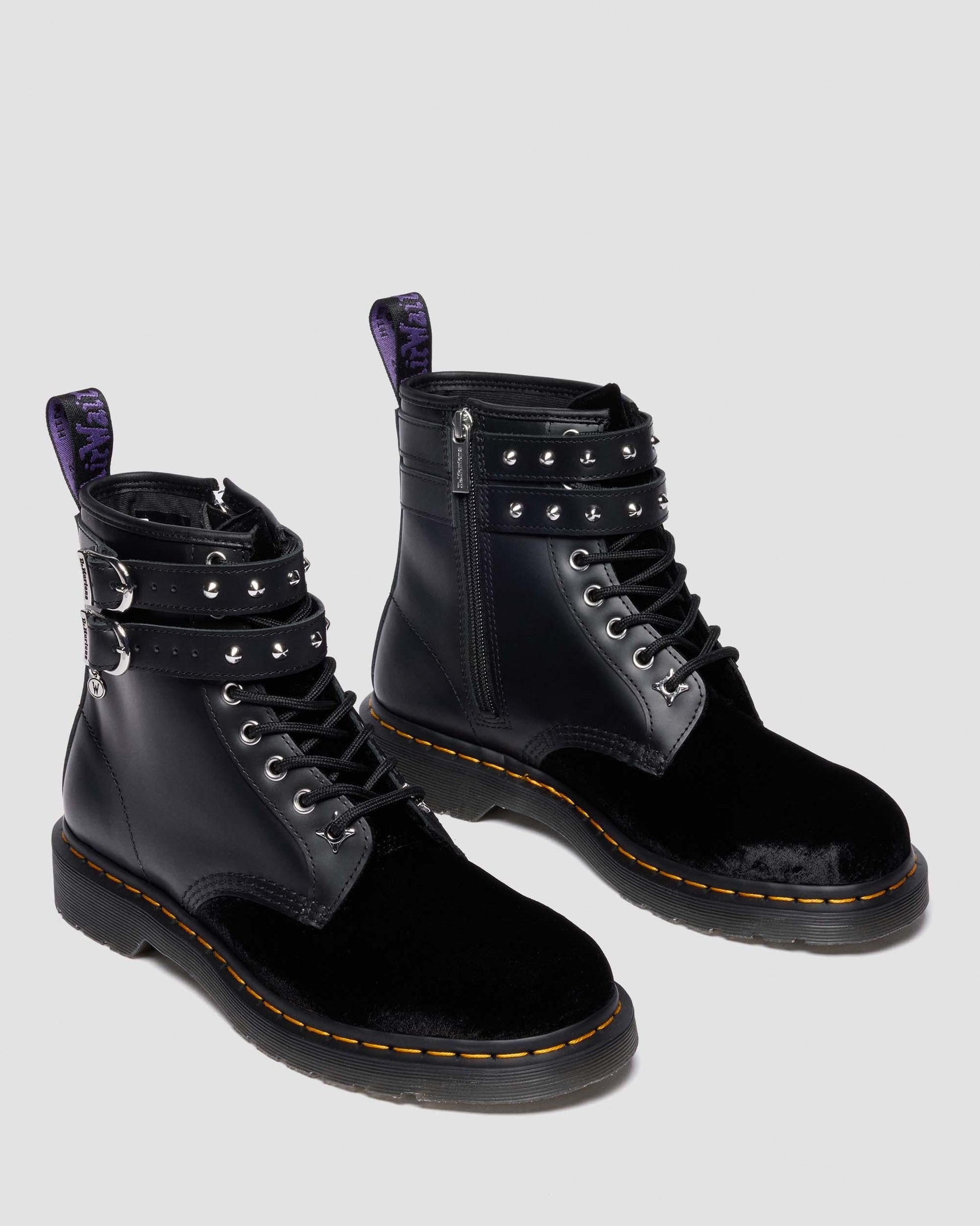 Outcasts are in. Reimagined for the second DM¡¯s x Wednesday drop, this limited-edition 1460 boot is updated in a tactile mix of black velvet and soft Nappa Lux leather. Buckled straps are punctuated with silver cone studs, a custom logo buckle, and a removable stained-glass window lace charm. The backstrap reads ¡®OUTCASTS ARE IN¡¯, and the heel loop is stitched in signature purple script. The black sole is locked in with Dr. Martens iconic yellow welt stitching.