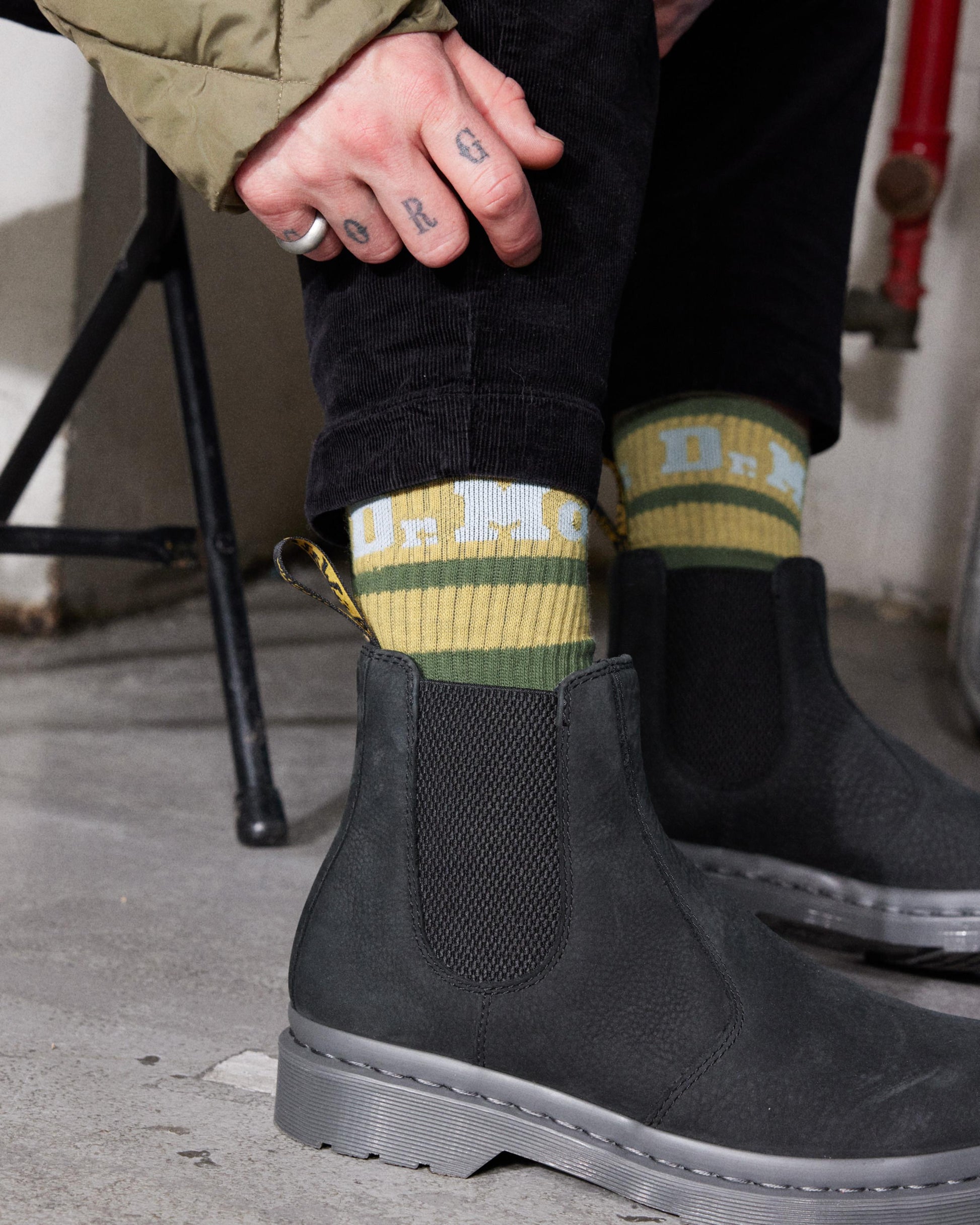Behind every pair of Docs is a great pair of socks, like these athletic socks with the immediately recognizable scripted Dr. Martens logo at the cuff.