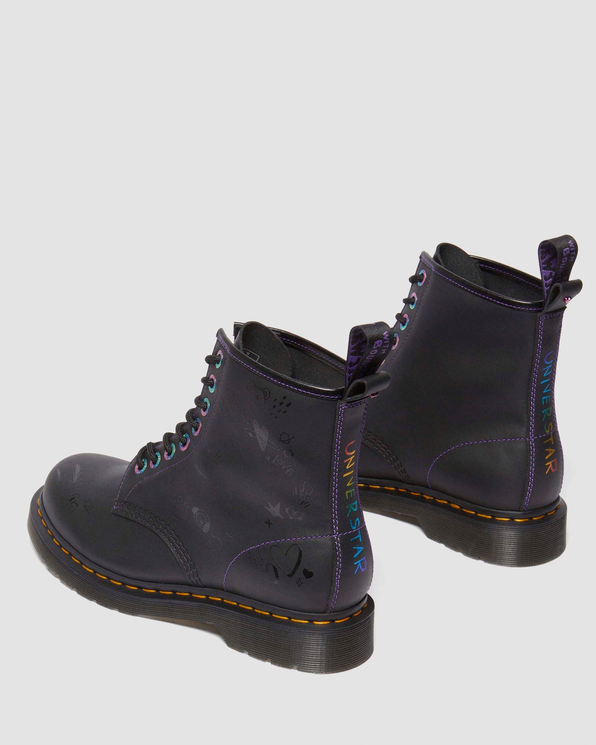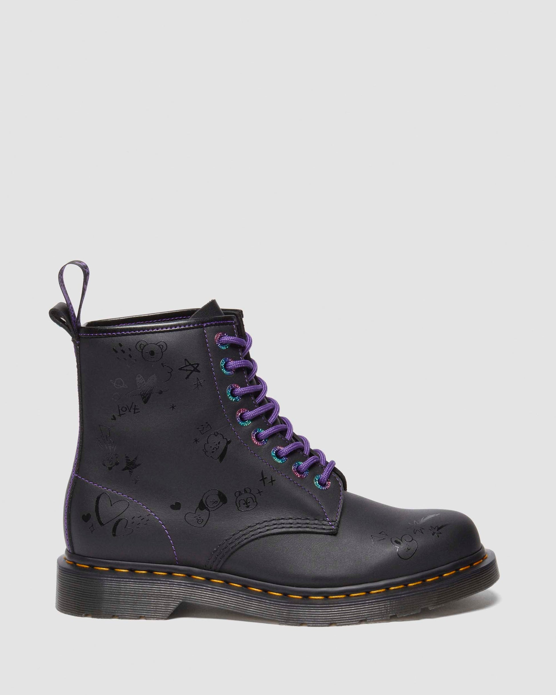 Express yourself in our latest collaboration with the BT21 Universe. Adorning the 1460 boot with playful characters and illustrations across the soft, Nappa leather. Highlighted with a rainbow print ¡®UNIVERSTAR¡¯ across the backstrap and iridescent hardware. Each pair comes with 2 sets of purple and black laces and an illustrated lace charm and finished with a limited edition purple AirWair heel loop with a hidden heart stud. Set on our famously hardwearing DMS outsole with a yellow welt stitch.