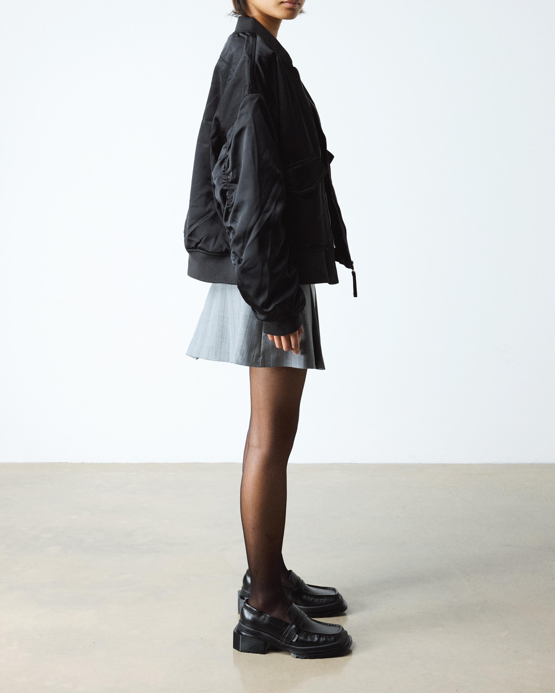 A refined edge. The square-toe Maybole redefined as a ruched, slip-on loafer. Crafted from subtle sheen, Milled Gloss leather. Each pair is set on a heeled angular, all black outsole with signature grooving.