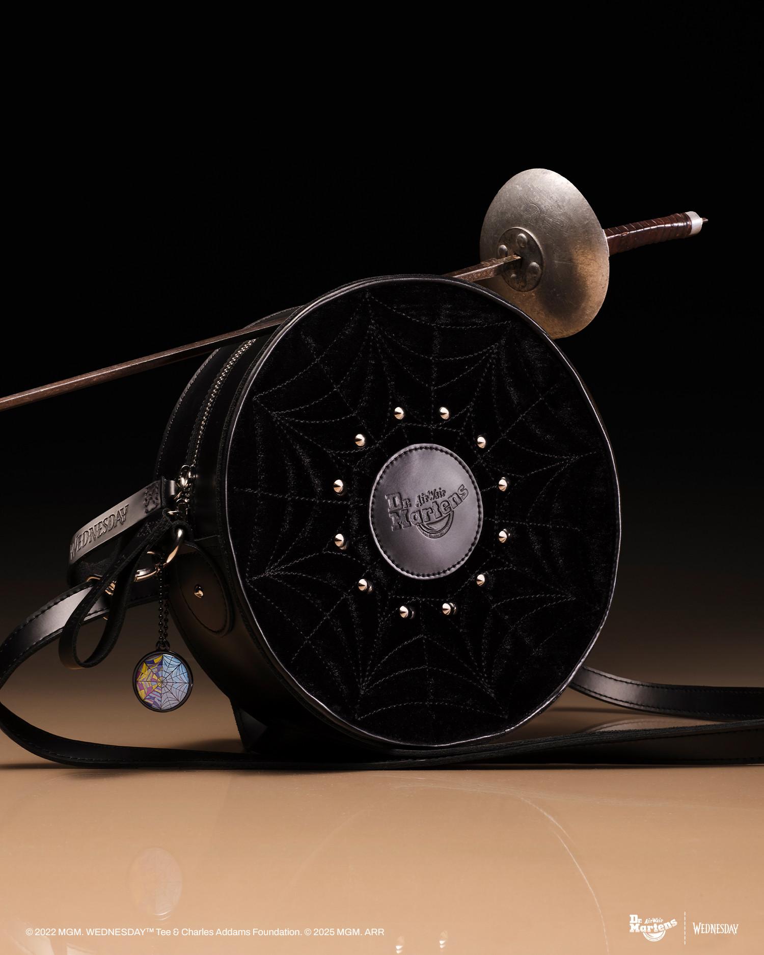 Dark romanticism distilled into a circular backpack. Built from black velvet and grounded with a hard-wearing black Kiev leather base. A spiderweb motif radiates across the front panel in intricate embroidery, punctuated with silver cone studs and debossed DM¡¯s x Wednesday branding. Velvet zip pulls and silver-tone hardware elevate the gothic detailing, while a removable stained-glass window charm channels the eerie elegance of Nevermore Academy. Finished with a hidden back panel pocket and adjustable straps for styling your own way.