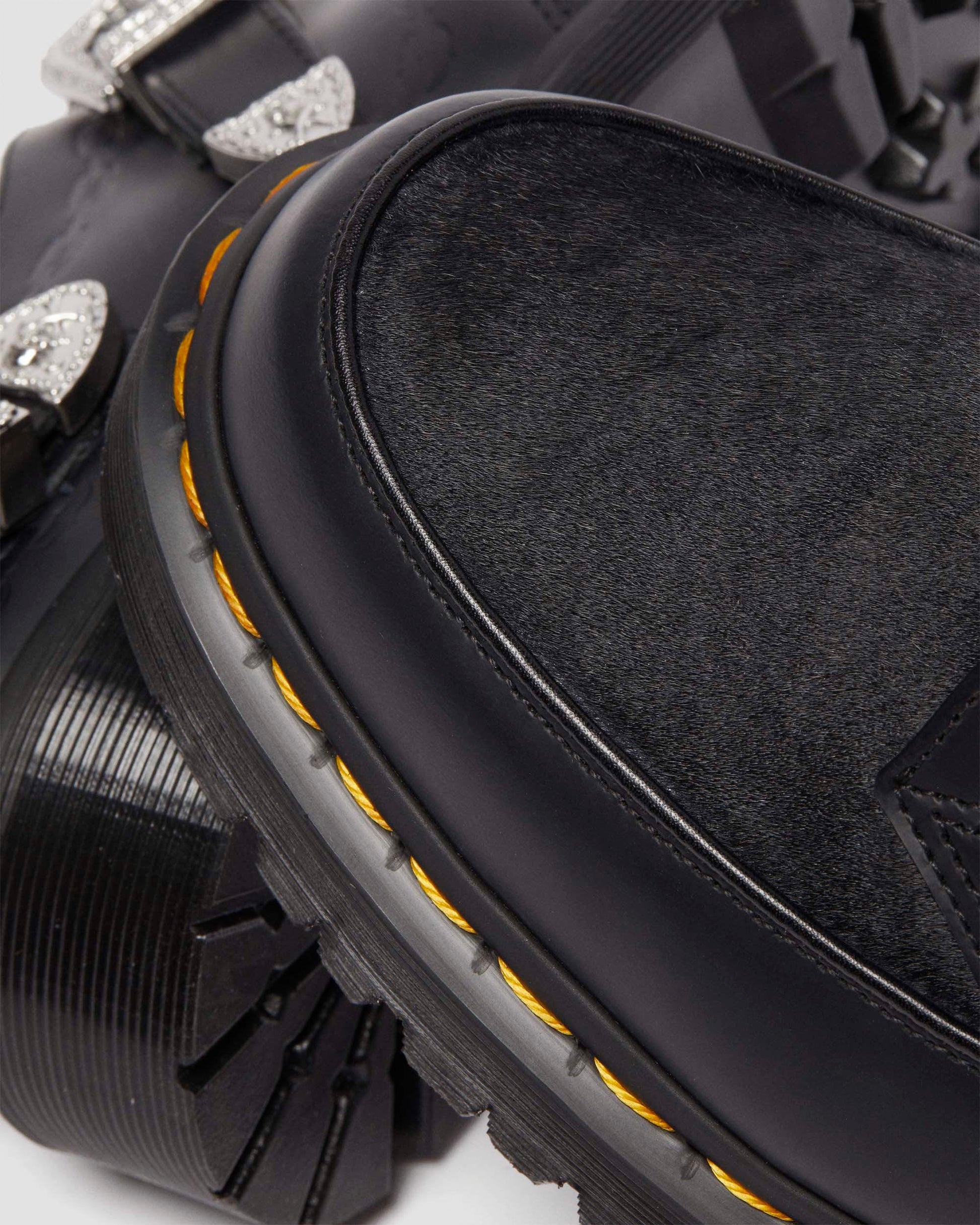 Our second collaboration with London jeweller The Great Frog includes this reworked version of our Ramsey creeper. It is made from black Smooth leather with a Hair-on vamp, with hardware engraved by TGF Creative Director Reino Lehtonen-Riley. The leather is detailed with debossed chain artwork, which also forms the border of the vintage-inspired silver buckles on the shoe¡¯s heel and Monk strap fastening. The rugged BEN sole is punched with our yellow welt stitching, and the sock is printed with the DM¡¯s x TGF logo.