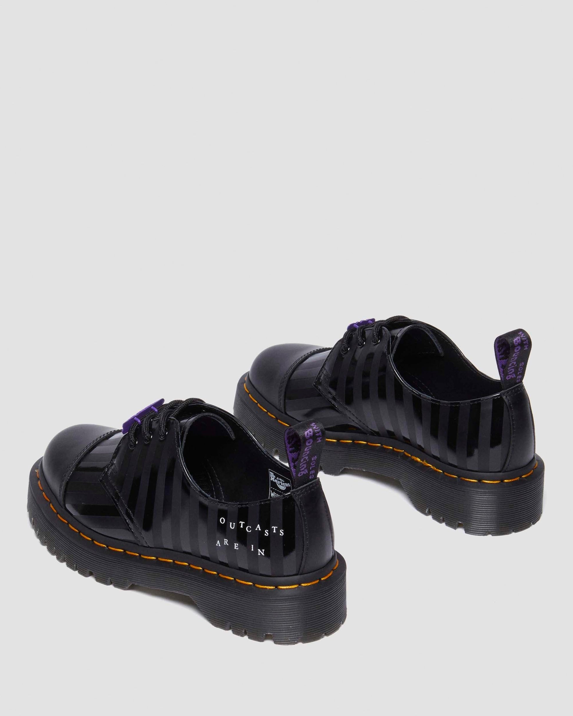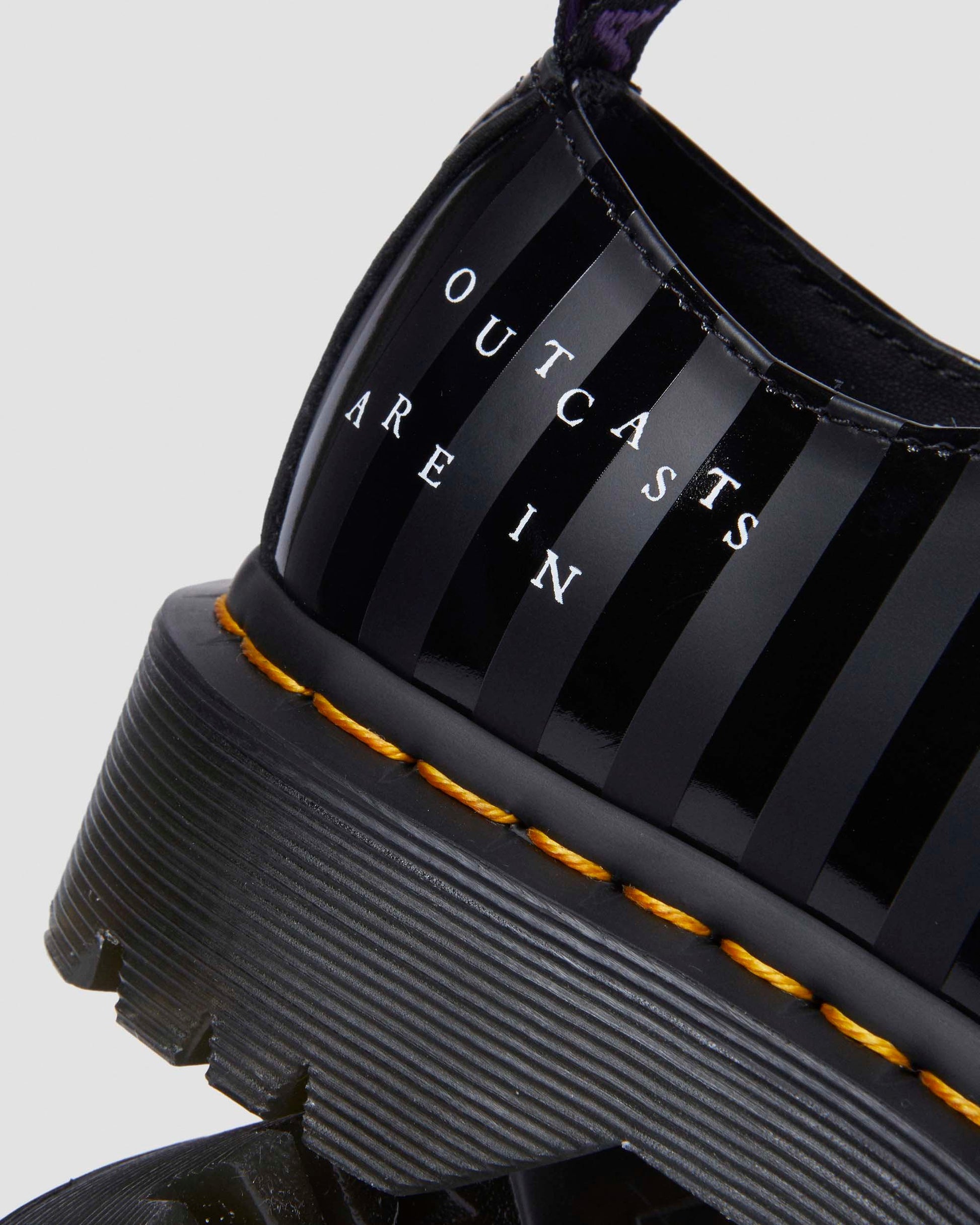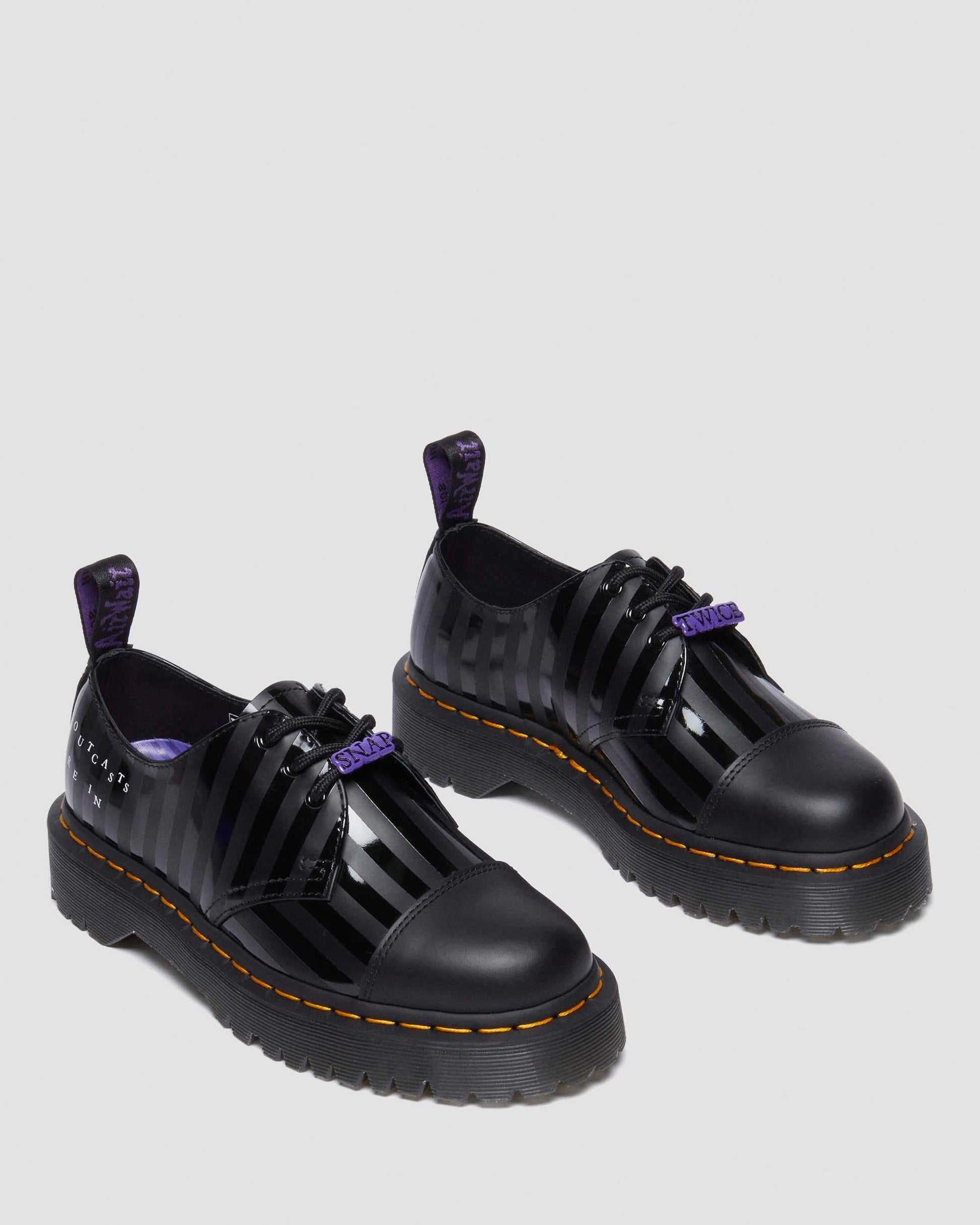 Outcasts are in. This limited-edition version of our DM¡¯s x Wednesday 1461 shoe is made with Smooth leather, a gloss stripe print, and a plain toe cap with stitch detailing. Purple accent details are throughout the shoe, including in the heel loop, the lace aglets, and the removable ¡°SNAP TWICE¡± lace charms. The heels are printed with white text that reads ¡°OUTCASTS ARE IN.¡± The Bex sole is secured with our classic yellow welt stitching.