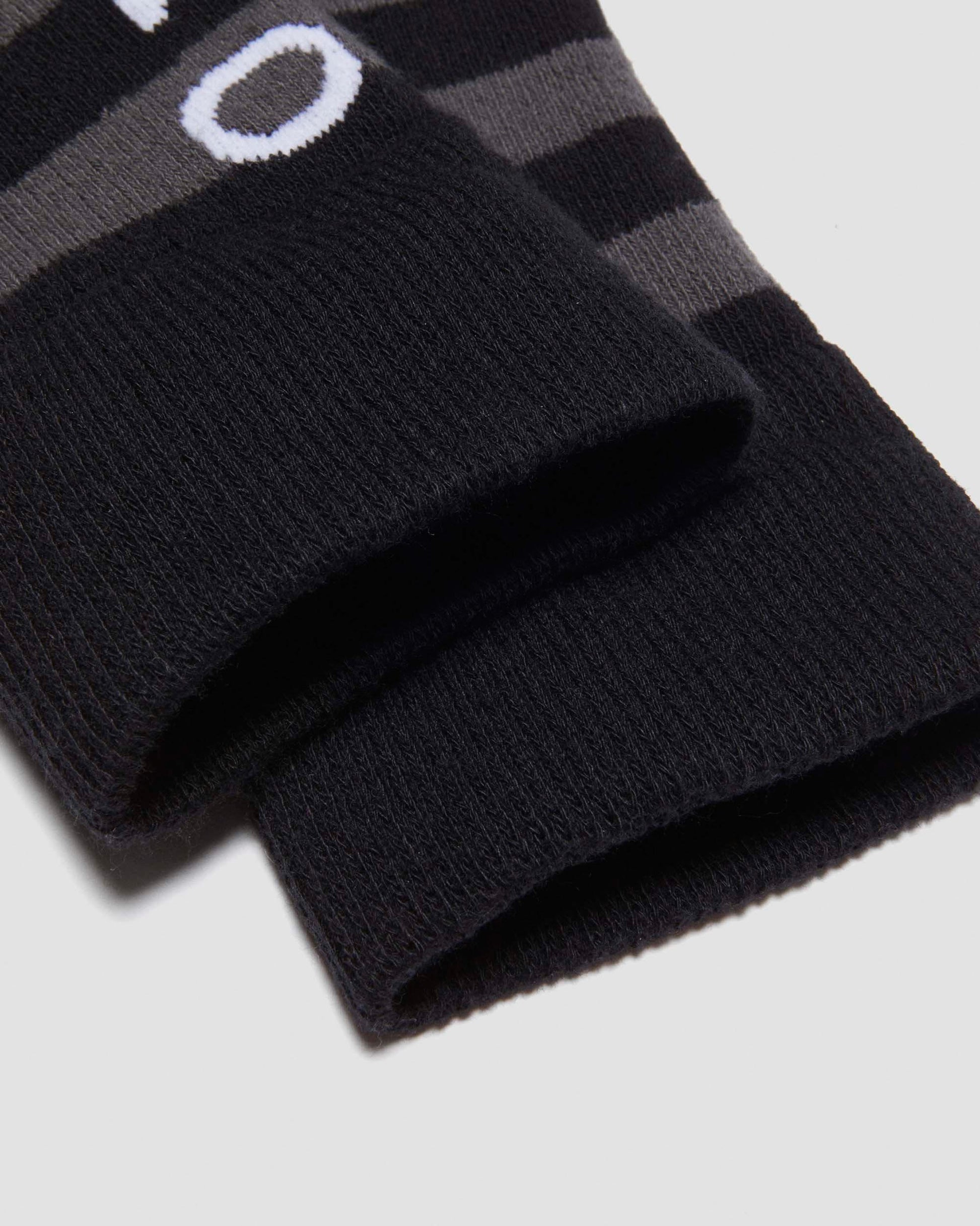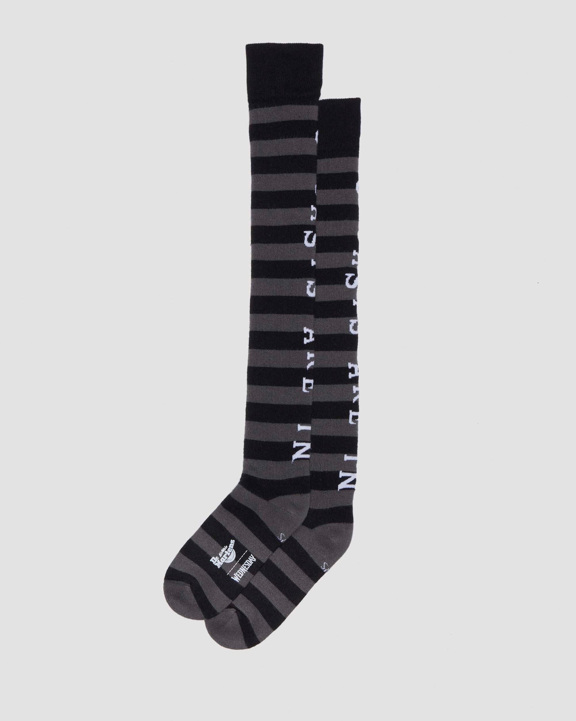 These limited-edition striped socks from our DM¡¯s x Wednesday collaboration are made with an organic cotton mix. They¡¯re detailed with black and grey stripes, a purple DM¡¯s x Wednesday logo, and white text that reads ¡°OUTCASTS ARE IN.¡±